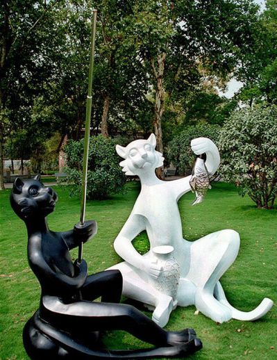 玻璃钢抽象大猫咪,黑白两色钓鱼猫咪