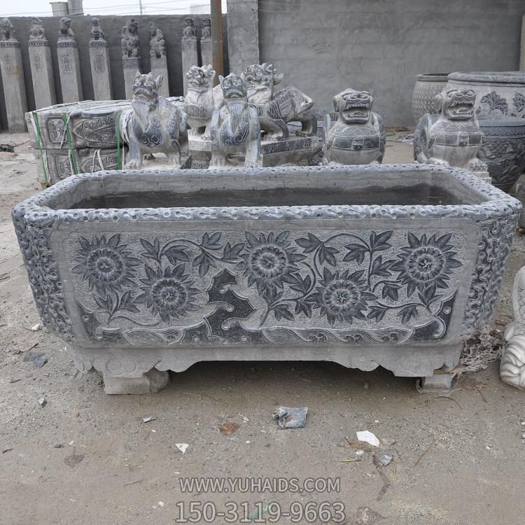 庭院摆放青石浮雕花长形老石槽水池养鱼水缸雕塑.详细说明