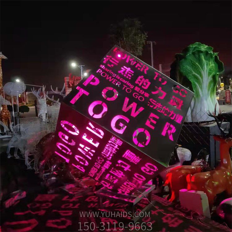 公园发光不锈钢镂空字体魔方雕塑.图片展示