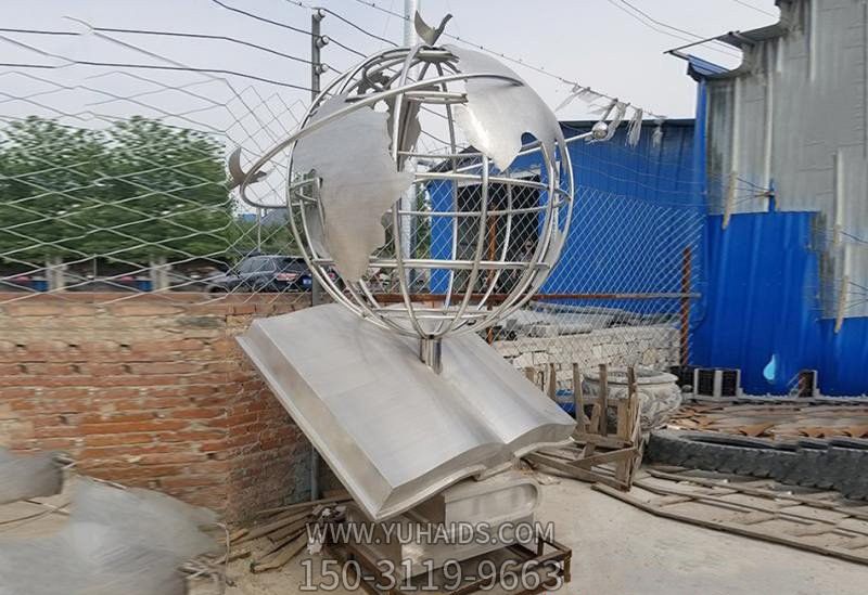 不锈钢白钢校园书本上的地球仪雕塑.详细说明