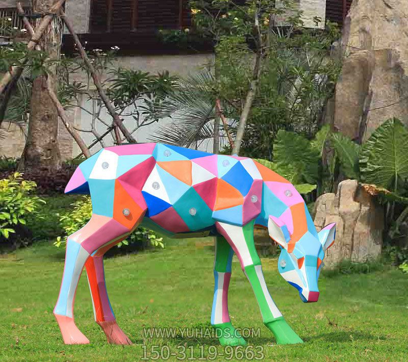 公园景区玻璃钢彩绘几何低头觅食的鹿雕塑.图片展示