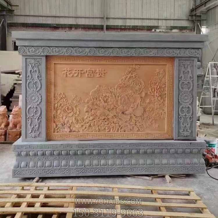 中式庭院门口摆放青石浮雕花开富贵影背墙雕塑.详细说明
